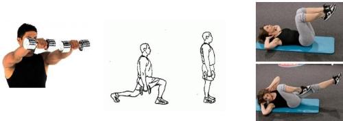 Arms: Front Raises               Legs Front Lunges                           Abs: The Bicycle